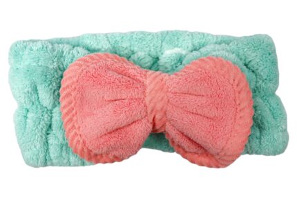 Cintillo de suave y absorbente toalla elasticado con diseño de moño. Disponible en cuatro colores: Turquesa, Beige, Amarillo, Rosado