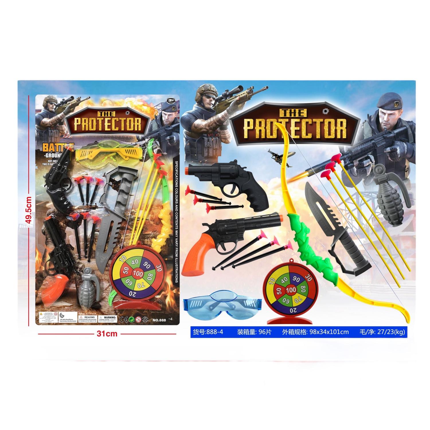 Set completo: Incluye dos revólveres de juguete, un arco con flechas de succión, un cuchillo táctico, dardos de succión, una granada, gafas de protección y una diana de puntuación.