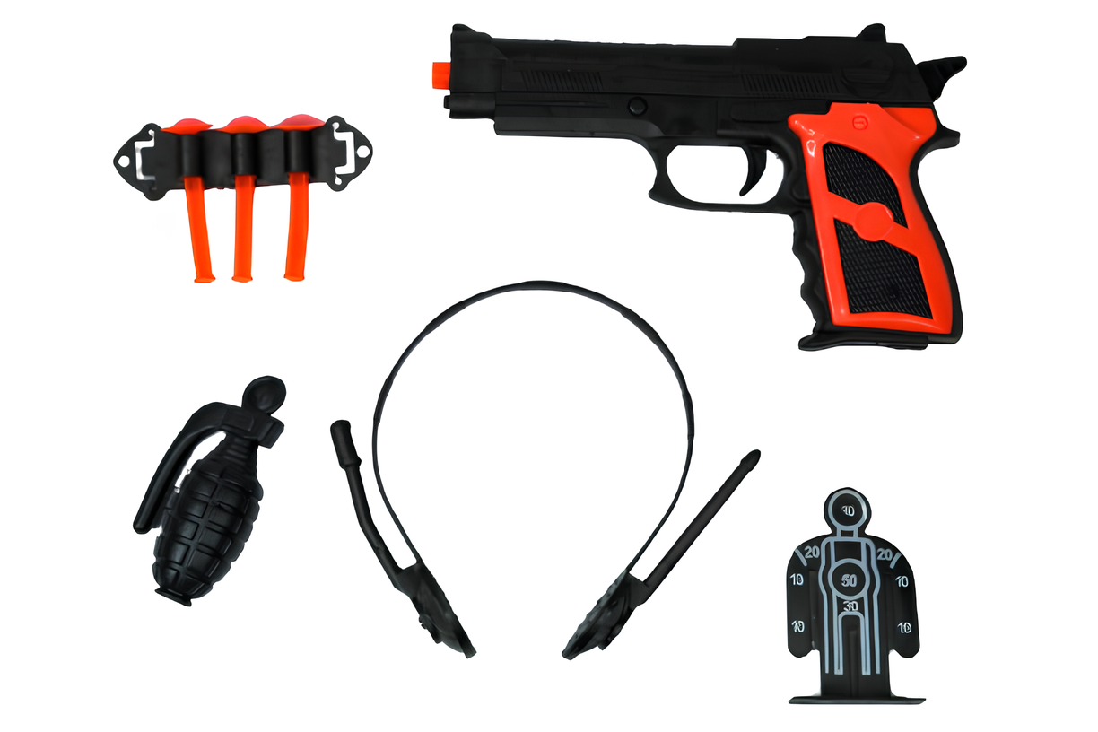 Set misión policial, interesante lanzador con tres dardos de plástico pequeño, terminado en ventosa, trae un audífono con micrófono, una granada y tiro al blanco.