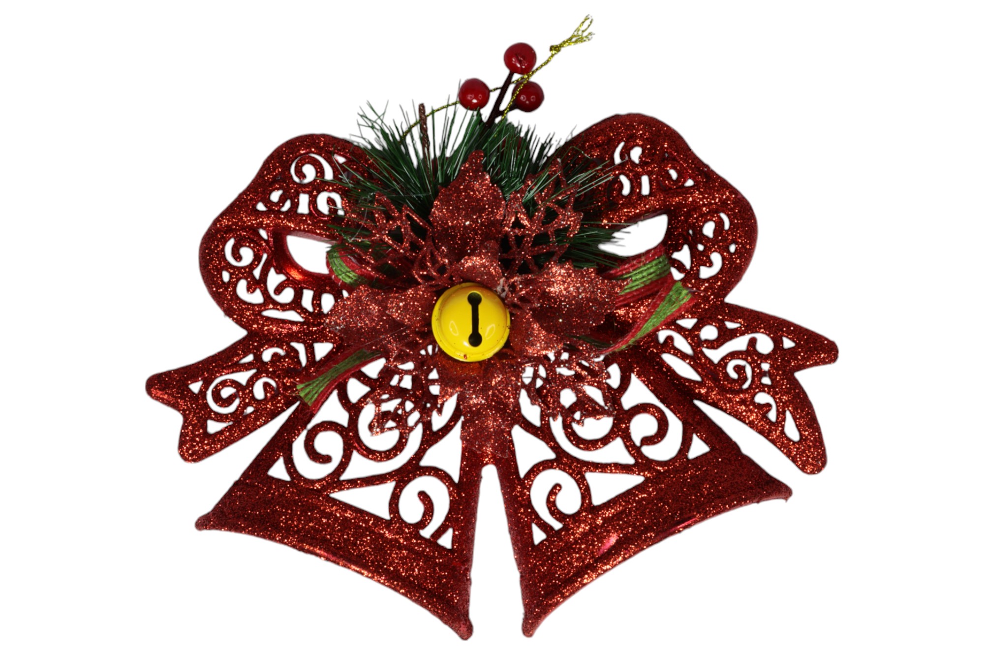 Patrones: Las campanas están adornadas con la típica flor una cinta verde con rojo, ramitas de pino verde y bayas rojas, un cascabel amarillo o rojo en el centro, que les dan un toque natural y navideño.